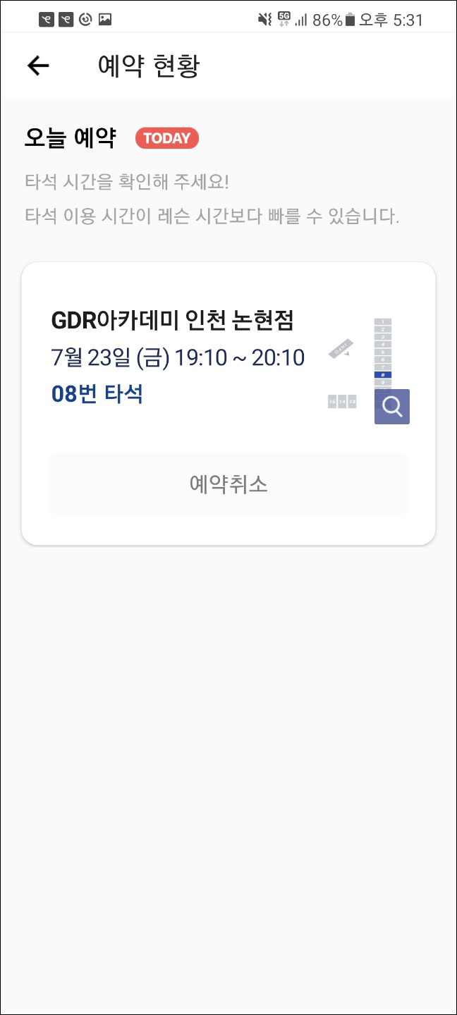 스마트폰의 GDR 어플을 실행하고, GDR 어플의 예약하기 화면에서 원하는 시간과 타석을 예약한다.예약이 완료되면 예약현황에 본인이 예약한 타석의 현황을 확인할 수 있다.오늘은 19:10 8번타석 예약을 하였다.